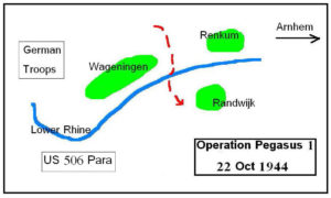 Lt Col David Dobie, had been sent across the Rhine on the 15 October to coordinate the operation with Dick Kragt, who was coordinating the Dutch side of the operations. ‘Operation Pegasus 1’ took place on the night of the 22/23 October. 138 escapers, mainly British Airborne, together with a number of Dutch Resistant’s were led to the Rhine. ‘Markers’ were laid out through the woods by men of the Glider Pilot Regiment; a bridgehead had been set up on the north bank by men of the US 506 Parachute Regiment; British and Canadian Engineers supplied the boats. Red tracer was used to mark the route to the south bank.